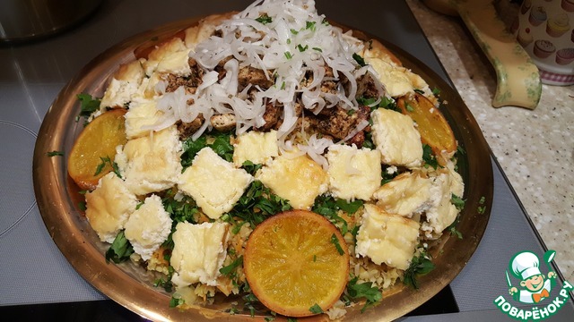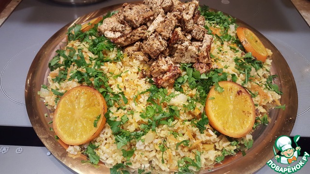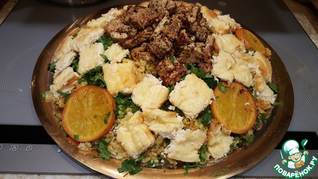 | Блюдо из риса индика brown от ТМ Мистраль с апельсинами, морковью, белым луком, жареным маринованным адыгейским сыром, омлетом, маринованным белым луком, петрушкой и специями. А вобще это гарнир... хотя... очень вкусно, сытно и вполне самодостаточно!!! Кстати, остывший рис так же бесподобно вкусен, как тёплый!!! Интересно?! Заходите и угощайтесь!!! |