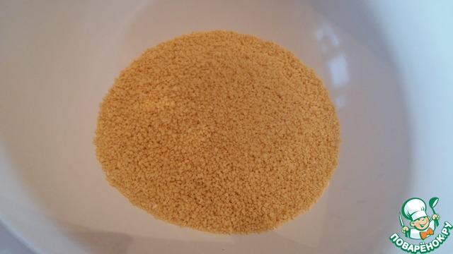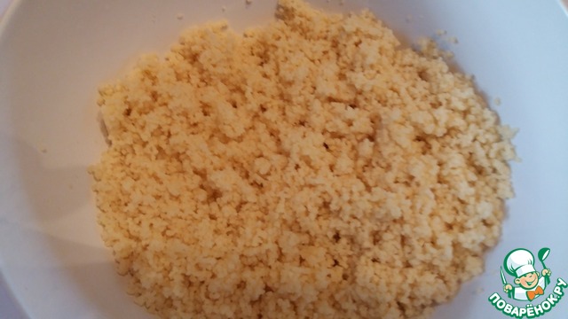Кус-кус насыпаем в большую миску, с учетом того, что он сильно увеличится в объеме и и заливаем кипятком в соотношении на 1 чашку крупы - 2 чашки воды. Накрываем крышкой и забываем о нем минут на 15.