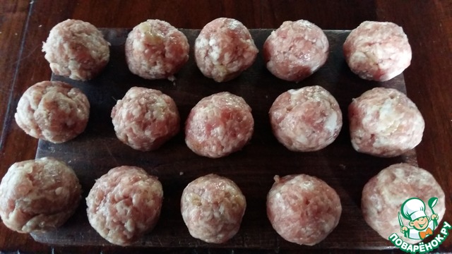 Скатать из фарша маленькие фрикадельки, размером с грецкий орех, выложить на разделочную доску и убрать в холодильник.