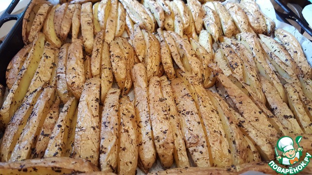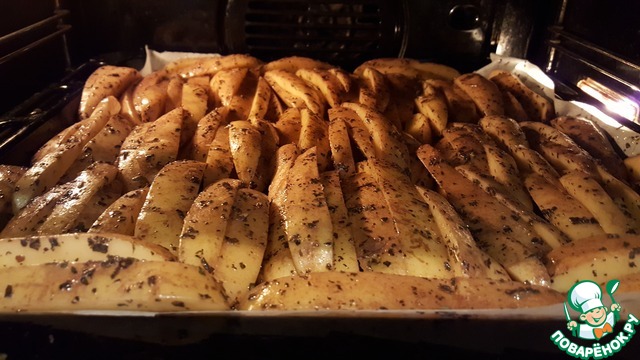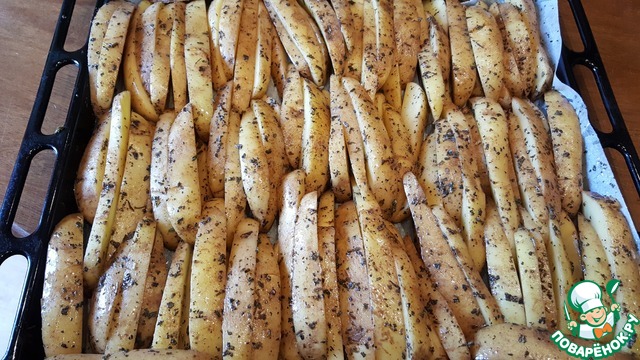 Сбрызгиваем картофель оливковым маслом. Удобно надеть одноразовые перчатки, растираем масло по поверхности каждой дольки картофеля. Выкладываем дольки на противень вплотную друг к другу - частоколом, шкурой вверх. Такая укладка поможет избежать подгорания картофеля при выпечки по бокам, а шкура предохранит верх.