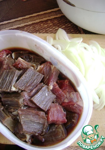 Мясо нарезать средними кубиками. Лук нашинковать полукольцами.
