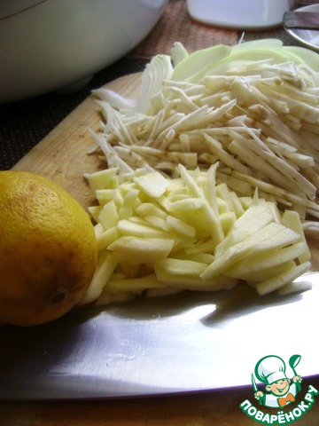 Нашинковать соломкой сельдерей и очищенное яблоко.