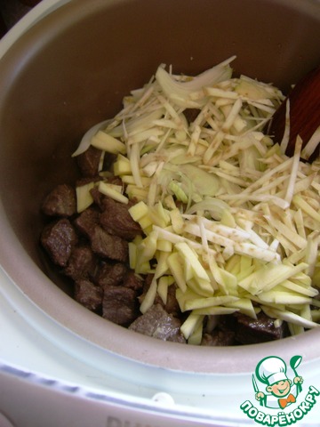 В чаше мультиварки –или глубоком сотейнике –разогреть масло и обжарить мясо до румяной корочки. Выложить лук и овощи, перемешать и жарить под крышкой до легкого румянца.
