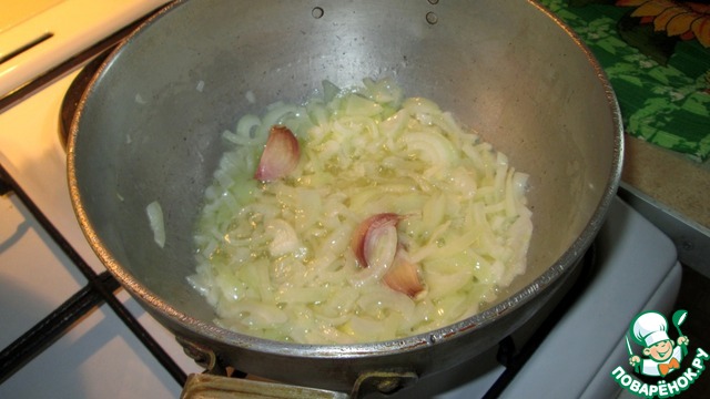 Жарить до прозрачности лука, чеснок потом выбросить.