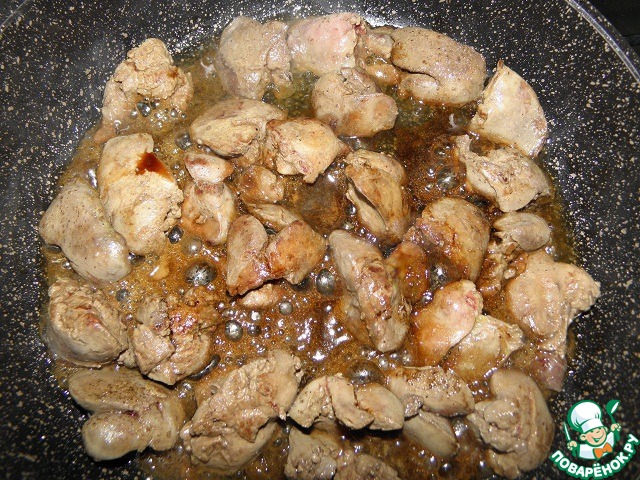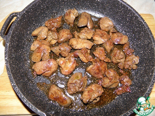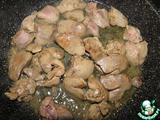 Печень промыть, очистить, обсушить, на сковороде разогреть раст. масло, обжарить печень буквально несколько минут, (2-3) посолить, поперчить.