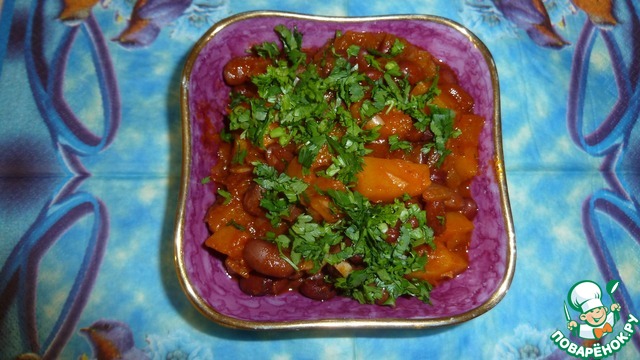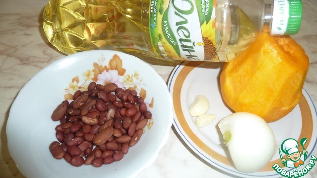 Фасоль, замоченную на ночь, отварить до полу готовности. Тыкву нарезать кубиками, лук мелко нарезать, 2 зубчика чеснока порезать тонкими лепестками.