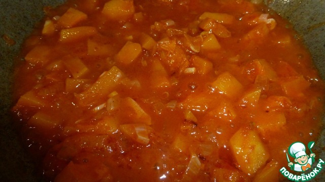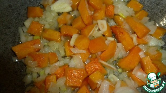 Обжарить на растительном масле тыкву, лук, чеснок и тушить 10 минут. Добавить специи - паприку, кайенский перец, имбирь. Посолить, добавить сахар и тимьян. Готовить 2-3 минуты.