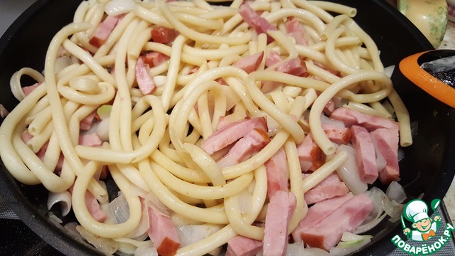 Нарезать ветчину полосками и лук мелким кубиком. Нагреть сковороду. Растопить масло и обжарить ветчину с луком пару минут. Добавить отварные спагетти. Перемешать.