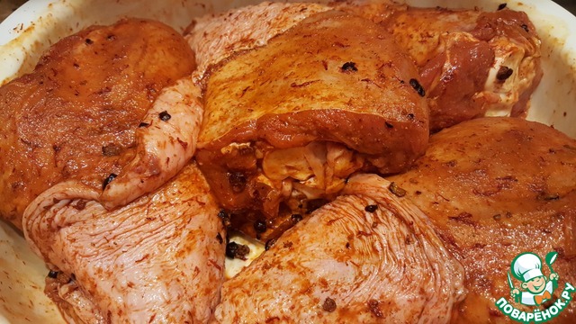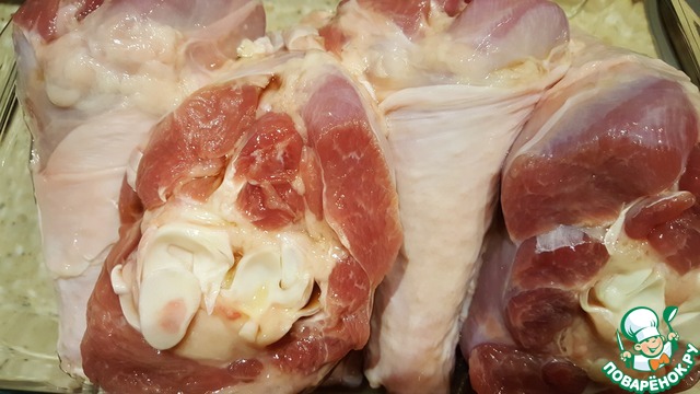 Вымыть голени, т. е. ноги индейки. Обсушить. Сложить в ёмкость для маринования.