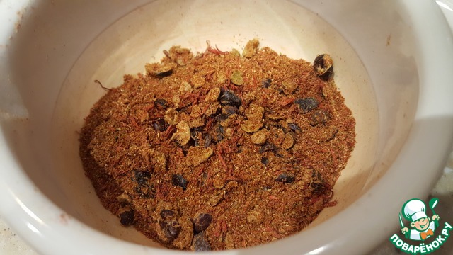 Смешать в ступке специи. Раздавить ягоды можжевельника.