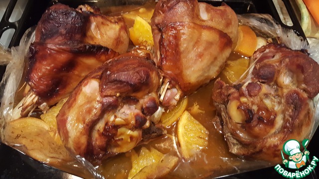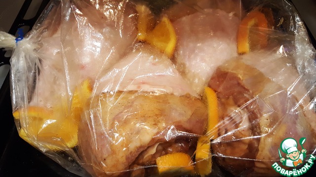 Достаём голени из холодильника. Промываем в холодной воде, обтираем насухо и складываем в рукав для запекания. Смазываем голени сверху оливковым маслом и добавляем в рукав дольки апельсина. Включаем разогрев духовки 200*.