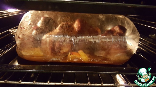 Защепляем края рукава специальными стяжками. Отправляем пакет в духовку на 90 минут. Ориентируйтесь на Вашу духовку!!!