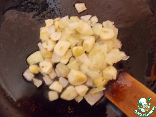 В сковороде на растительном масле обжарить мелко нарезанный лук до легкого, золотистого цвета.