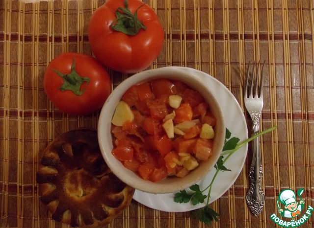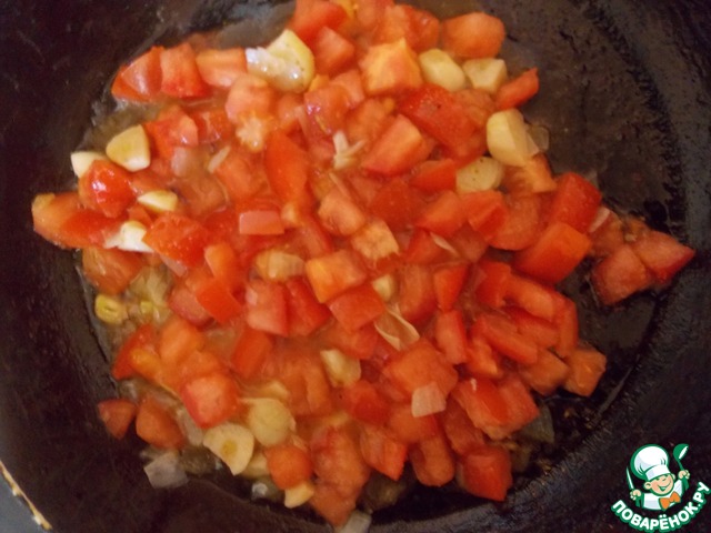 Добавить измельченный чеснок, кориандр и мелко нарезанные помидоры. Хорошо перемешать и тушить 1–2 минуты.