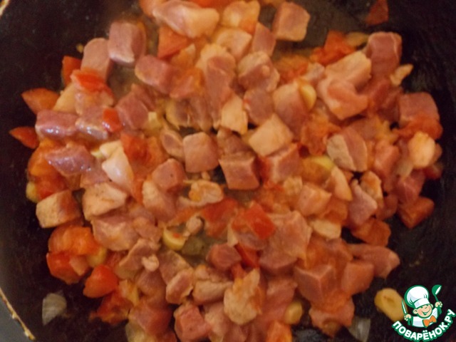 Мясо, нарезанное мелкими кусочками положить в сковороду, посолить, поперчить, накрыть крышкой и тушить 10 минут, периодически помешивая.