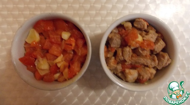 На дно горшочков положить рис. В постное блюдо добавить овощи, а в скоромное сверху выложить мясо с овощами.
