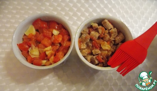 Плотно накрыть формочки тестом. Смазать тесто взбитым яйцом.