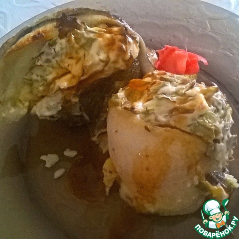Заполнить начинкой в следующей последовательности: рис-морковь с луком-рис-соевый соус-сыр с зеленью