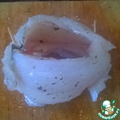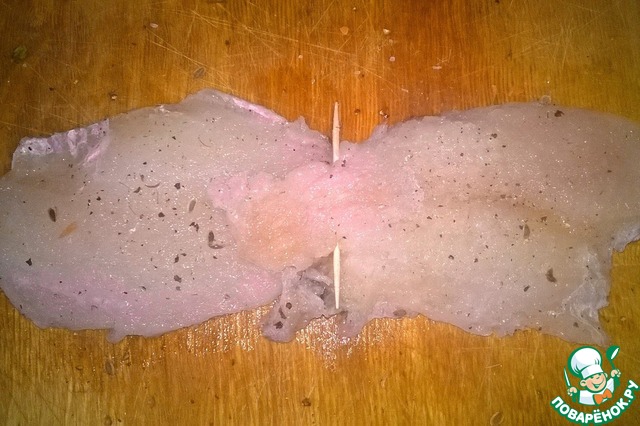 Филе камбалы посолить, поперчить и скрепить зубочистками