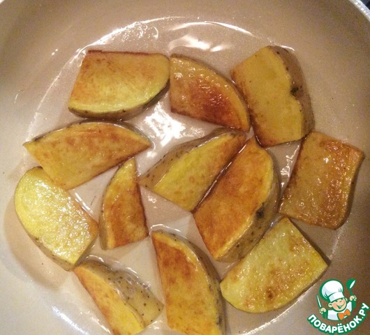 Картофель тщательно моем и режем вдоль на 6 долек. На сковороде разогреваем растительное масло и обжариваем картофельные дольки с 3-х сторон до золотистой корочки.