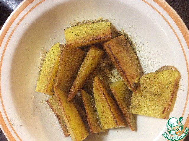 Выкладываем в тарелку и сразу щедро посыпаем мелкой солью и приправой для картофеля.
