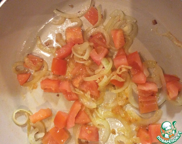 Пока картофель жарится, очистим лук и нарежем его тонкими полукольцами. Помидор нарежем кубиком размером около 1,5-2 см. На сковороде разогреем 1 ст. ложку растительного масла обжарим лук до легкого золотистого цвета. Добавим нарезанные помидоры. Жарим еще 3 минуты.