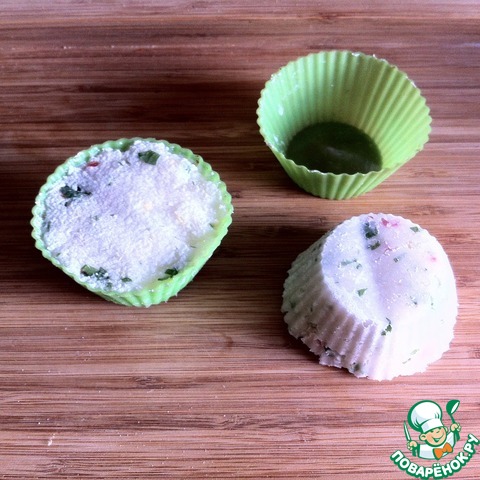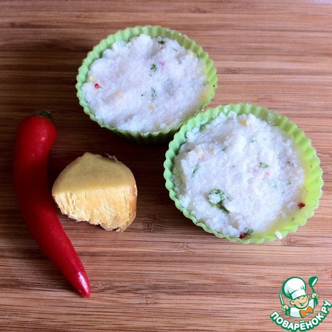 Добавить в рис мелко нарезанный очищенный имбирь, кинзу и чили без семян. Уложить массу в силиконовые формочки и убрать на час в морозилку.