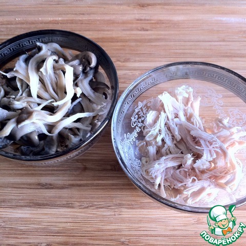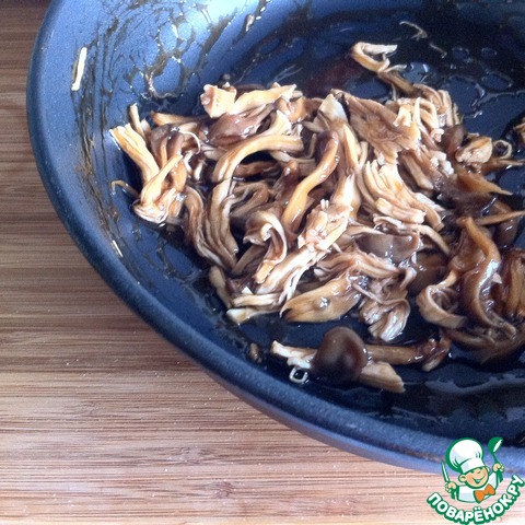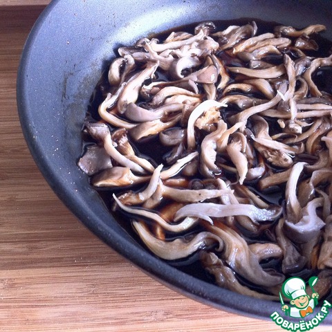 Еще через 1-2 минуты вынуть две трети грибов с частью соуса. К оставшимся вешенкам выложить куриное филе. Прогреть еще пару минут.
