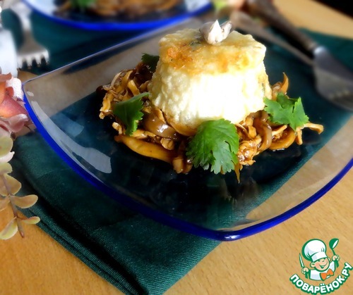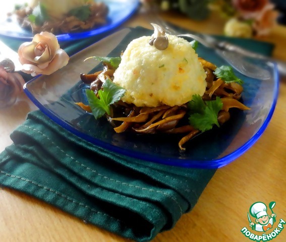 | Нежный пудинг в хрустящем кляре с грибами в пряном соусе. Для разнообразия в одну порцию можно добавить куриное филе. |