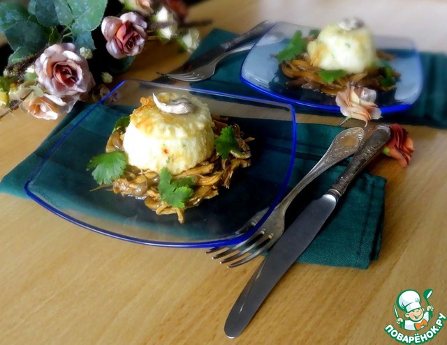 На другую тарелку выложить грибы с курицей, поверх них пудинг.
