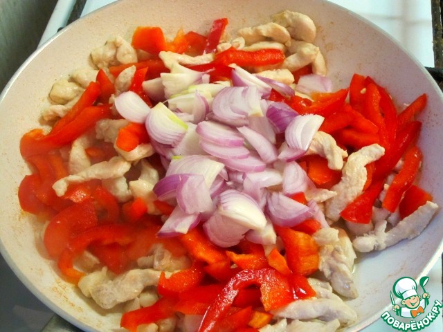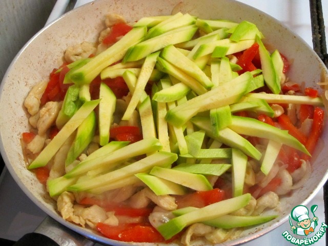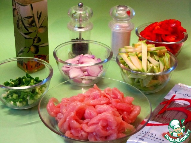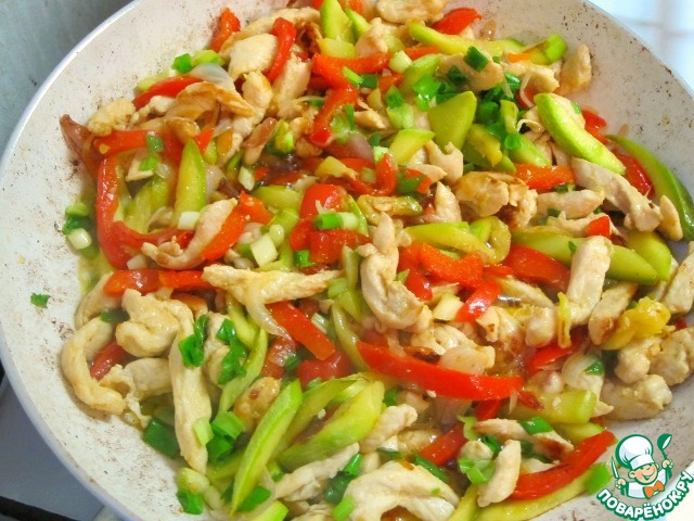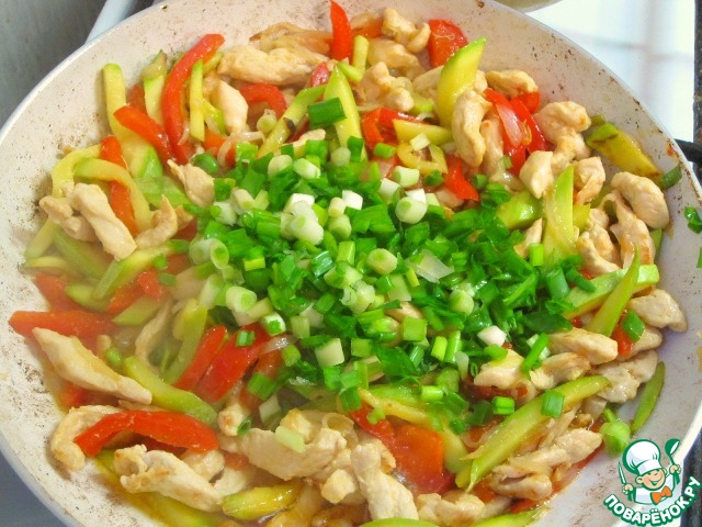 Куриное филе вымыть, обсушить бумажным полотенцем, нарезать тонкими полосками. Перец сладкий красного цвета, он более ароматный, и красный лук нарезать соломкой. Цуккини нарезать брусочками, 4 стебля зеленого лука нарезать мелко.