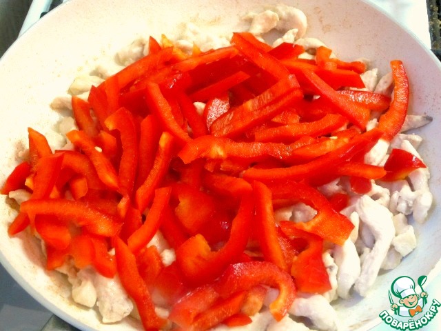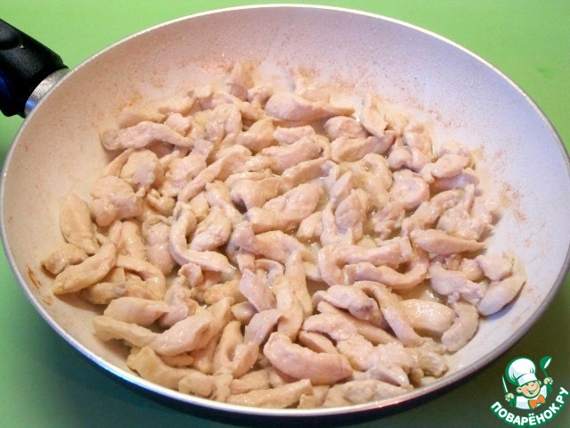 На сковороде разогреть растительное масло, обжарить куриные полоски.