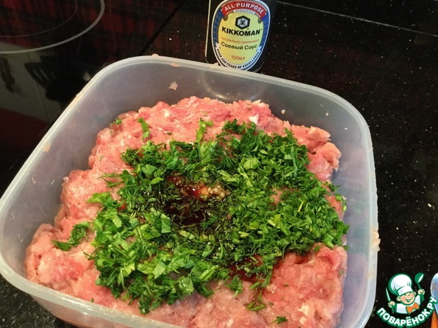 Зелень вымойте, обсушите бумажным полотенцем, порубите и добавьте к фаршу. Приправьте перцем и соевым соусом (3 ст. л.).