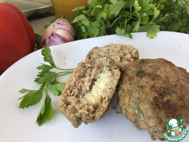 Из фарша сформируйте лепешку, посередине положите сыр, сверху накройте такой же лепешкой и сформируйте котлету.