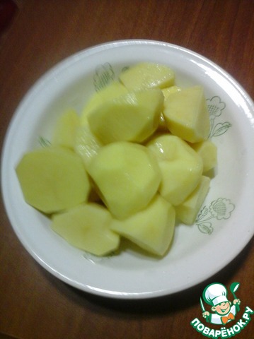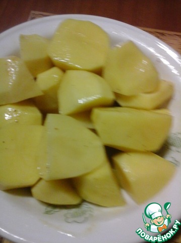 Картофель очистить. крупный порезать на четвертинки, мелкий - напополам. Отмыть холодной водой от крахмала.