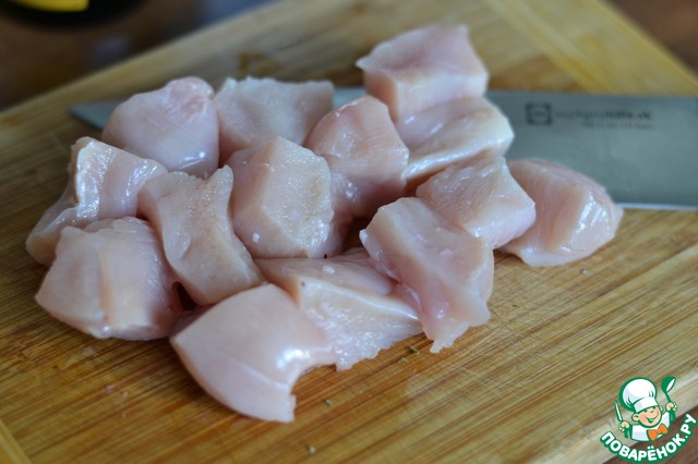Куриное филе нарезать на кусочки 2см.