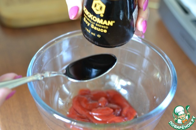 В миске смешать мед, томатную пасту, соевый соус "Киккоман" и розмарин.