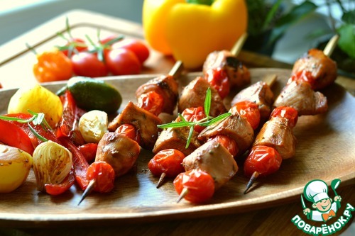 Нанизываем кусочек куриного филе, затем помидорку, опять филе.