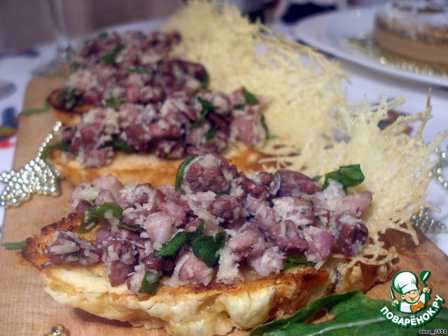 На кусочки багета выложить печеночную смесь и украсить сырными чипсами.