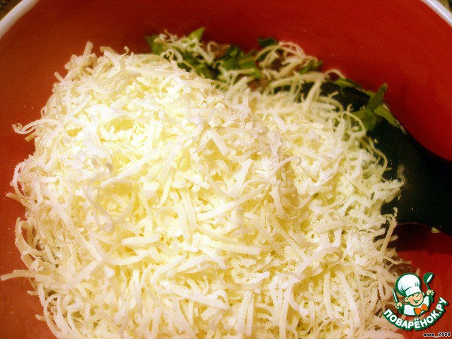 Пармезан натереть на мелкой терке. Половину пармезана добавить к мясу, перемешать,