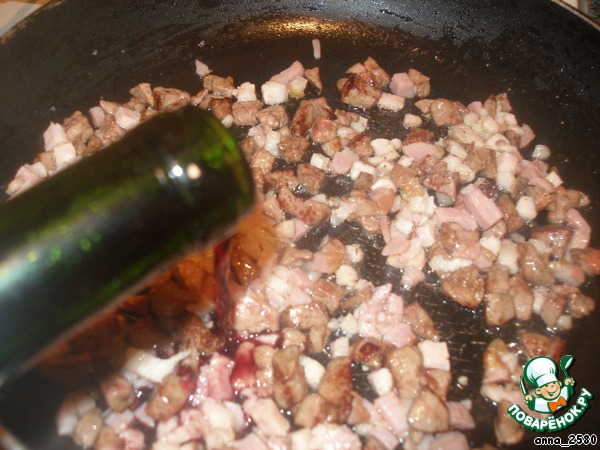 Грудинку также мелко нарубить и отправить в сковороду к печени. Жарить еще 1-2 минуты.