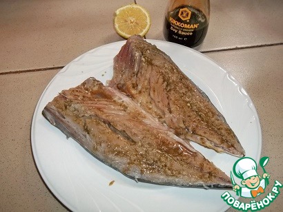 У меня скумбрия, но можно взять практически любую рыбу - треску, морской окунь, хек и т. д. (кроме красной - с такой рыбой я не пробовала). У рыбы отрезать голову, разрезать вдоль хребта, удалить хребет и крупные кости. Хорошо промыть. дать стечь воде. Полученное рыбное филе слегка присолить. Смешать лимонный сок, соевый соус, щепотку смеси черного и белого перцев. Я также добавляю немного измельченной свежей зелени. Залить маринадом филе рыбы, оставить пока в стороне.