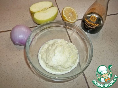 Половину большого яблока и средней красной луковицы натереть на мелкой тёрке. Добавить лимонный сок, горчицу и сливки. Перемешать.