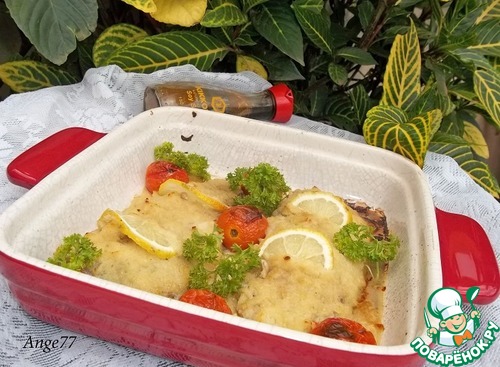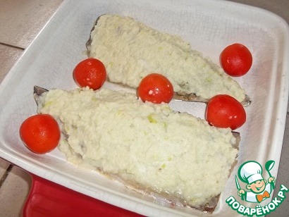 Керамическую форму для запекания смазать раст. маслом, выложить рыбу и распределить по всей поверхности рыбы яблочно-сливочное пюре. Можно добавить несколько помидор черри для украшения блюда. Запекать в разогретой до 200 градусов духовке под грилем примерно 30 минут (ориентируйтесь на свою духовку).