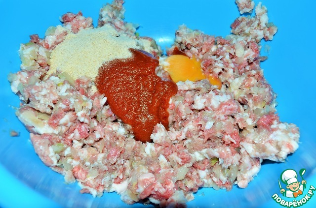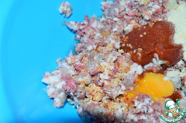 В мясо добавить желток ( белок делает котлеты плотными, более грубыми ), томатный соус ( это, наверное, самый необычный ингредиент в фарше, но он необходим. Придаст сочность, некую пикантность и окрасит в более интенсивный цвет ), панировочные сухари.