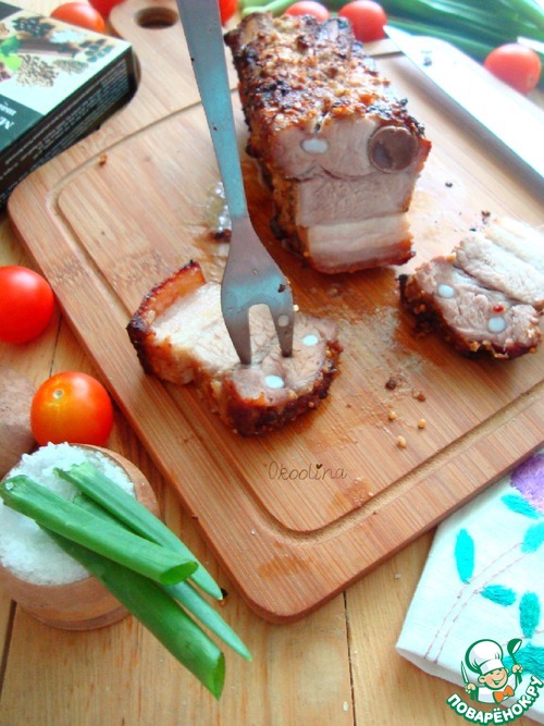 Ну как-то и всё. Грудинку делаем со всех сторон, часто переворачивая, где-то с час. Это зависит от величины и толщины куска. У меня ушёл один час.
