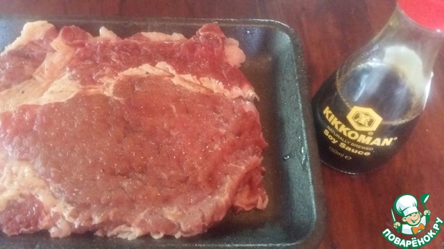 Мясо хорошо отбить, поперчить и промазать с 2-х сторон соевым соусом от ТМ "Киккоман".