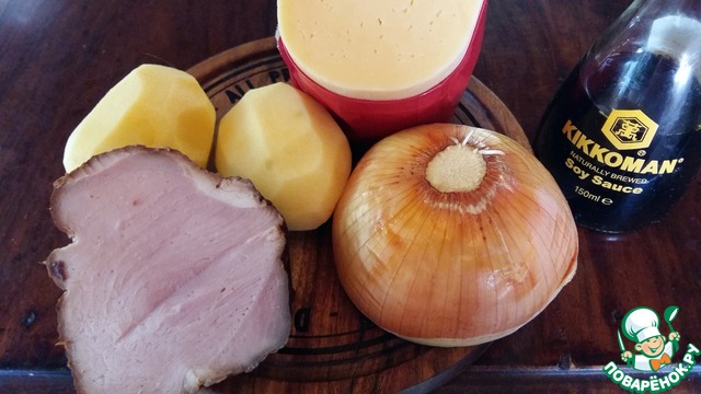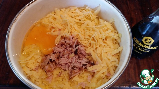 Картофель и сыр натереть на крупной терке, 1/2 средней луковицы и бекон - на мелкой. Чуть-чуть присолить, добавить 1 куриное яйцо и 1 белок, перемешать.