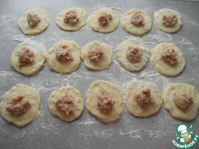 В середину лепешки поместить по 1 столовой ложке подготовленного фарша.