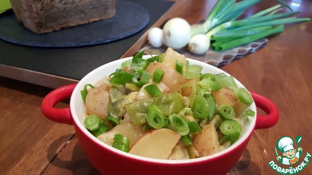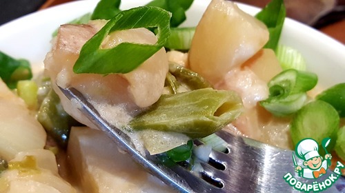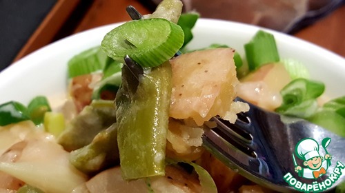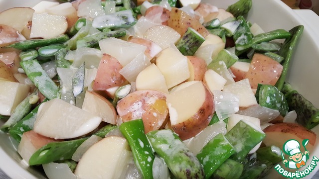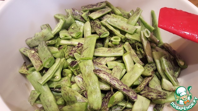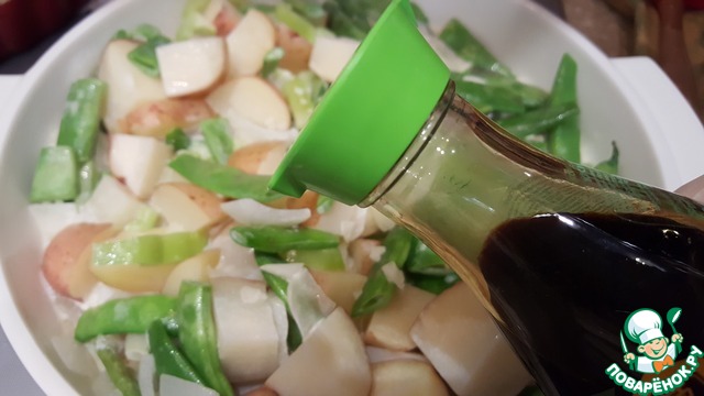 Далее логичнее загрузить картофель, но я положила фасоль. В результате в блюде она была мягкой, но держала форму. Выбор последовательности за Вами. Если хотите более хрустящую фасоль, добавьте её последней.